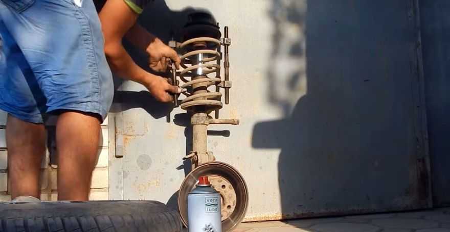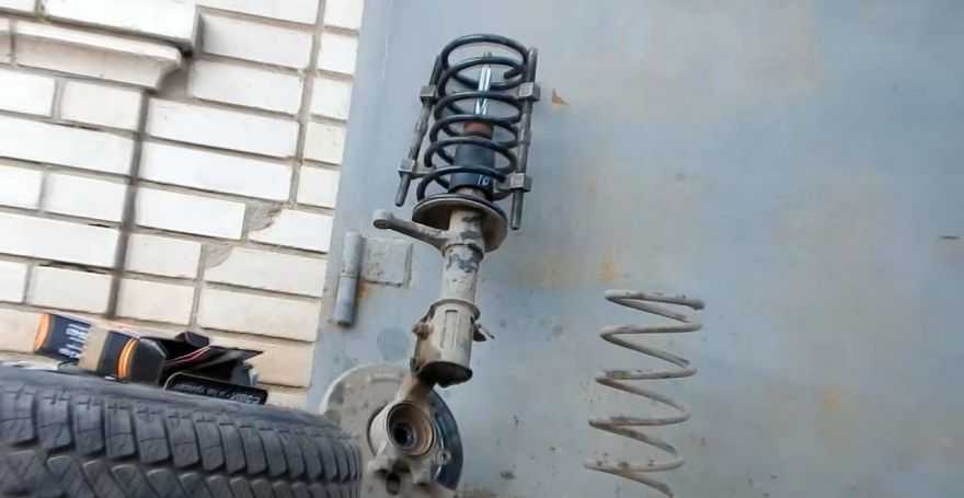 - После этого, стойка вытаскивается, а пружина отделяется с помощью съемника. Менять ее или нет – решаете вы. Чтобы ее вытащить, необходимо ее стянуть с помощью специальной стяжки. Затем пружину устанавливают на новую стойку и производят сборку всех элементов в обратной последовательности.