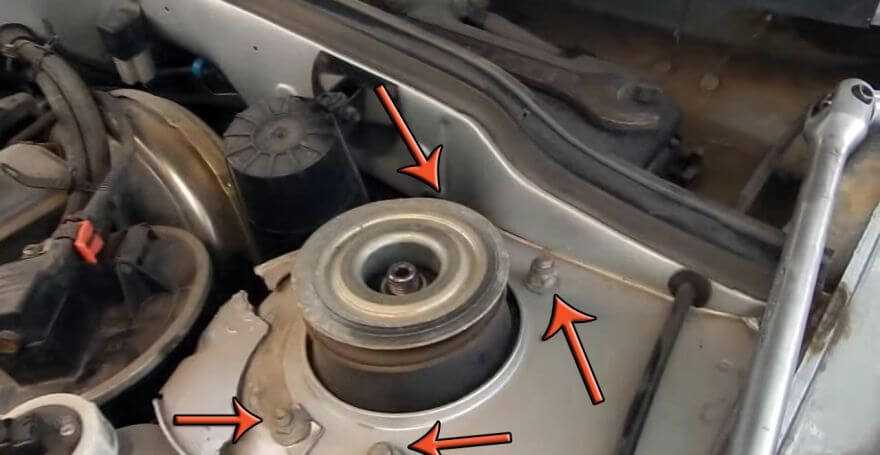 - Теперь снова возвращаемся в подкапотное пространство. С трех сторон от центра крепления стойки есть еще три гайки, которые удерживают опорный подшипник. Их тоже не обходимо открутить.