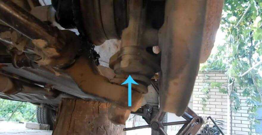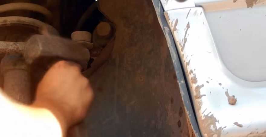 - Открутите гайку, которая удерживает болт крепления поворотного кулака к стойке. Если болт после этого не вытаскивается, наживите гайку и нанесите по ней пару ударов. Теперь гайка скручивается, а болт вытаскивается.