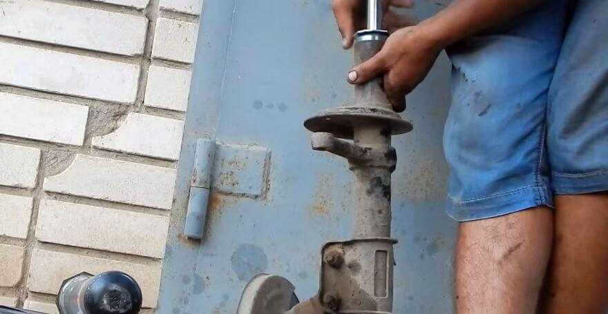 Снимаем резиновую заглушку верхней опоры и специальным ключом, позволяющим удерживать шток при отворачивании гайки, ослабляем соединение.