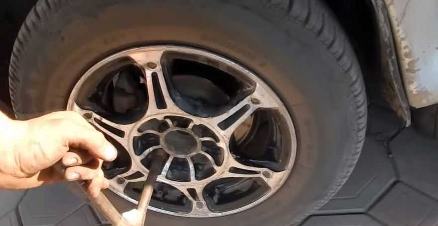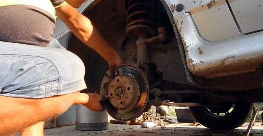 - Снимаем нужное колесо, не забыв упереть авто подставками против отката, а также включить скорость.