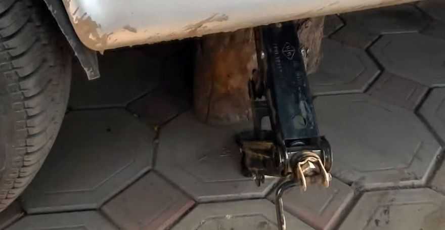 Теперь нужно поднять машину домкратом. Это нужно для того, чтобы нижний фиксатор стойки был в доступе. Этот болт чаще всего идет туго, поэтому его лучше предварительно покрыть специальной смазкой. Если и после этого крепеж не получается выкрутить, его нужно выбить болтом меньшего размера.