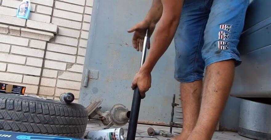 Ключом «на 19» откручиваем гайку рулевого наконечника. Вставляем лом…