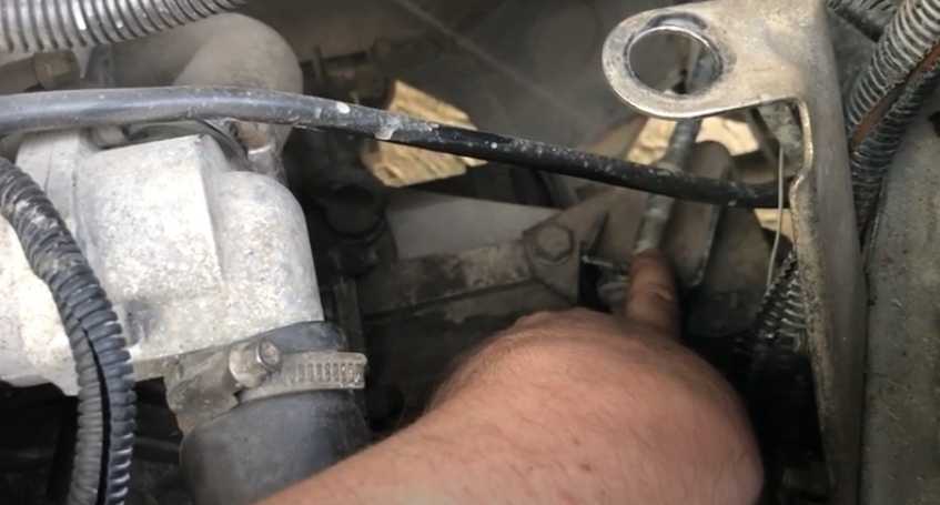 - Если машина начинает двигаться в конце хода педали, откройте капот и найдите место крепления тросика. Здесь расположены две гайки, которые можно открутить гаечным ключом на 17. Чтобы снизить свободный ход педали, то есть опустить ее, выкручивается болт, расположенный внутри кронштейна. А наружный винт при этом надо затянуть гаечным ключом.