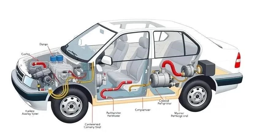Кондиционер в моей Калине работает по довольно простому принципу. Он состоит из нескольких основных компонентов: компрессора, конденсатора, испарителя, ресивера-осушителя и расширительного клапана. Компрессор сжимает фреон, повышая его температуру и давление. Затем горячий фреон поступает в конденсатор, где охлаждается и переходит в жидкое состояние. Далее жидкий фреон проходит через ресивер-осушитель, который очищает его от влаги и загрязнений. После этого фреон поступает в испаритель, где он расширяется и испаряется, отбирая тепло из воздуха в салоне автомобиля. И, наконец, газообразный фреон возвращается в компрессор, и цикл повторяется.