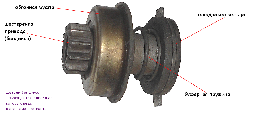 Бендикс, или обгонная муфта, служит для передачи вращения от стартера к коленчатому валу двигателя и его раскрутки. Конструкция бендикса такова, что после успешного пуска двигателя и начала его самостоятельного вращения, его шестеренка разъединяется с коленвалом, и работа стартера прекращается. Несмотря на качественную сталь, из которой изготавливается бендикс, его зубья со временем изнашиваются, что приводит к трудностям при попытках завести автомобиль — шестеренка просто проскальзывает, и оказывается не в состоянии зацепить маховик коленвала.