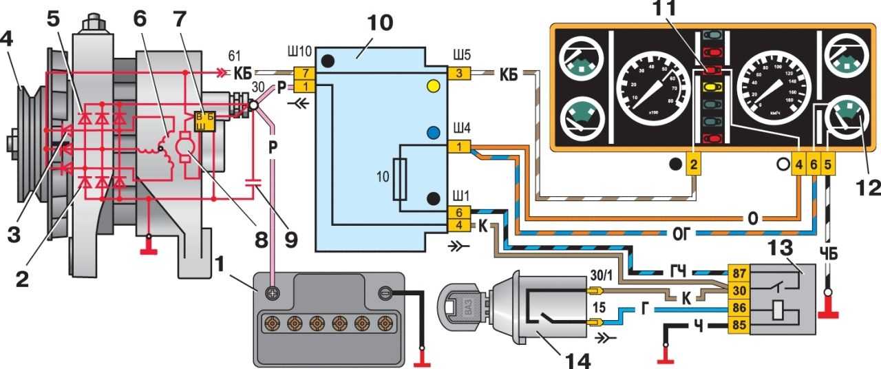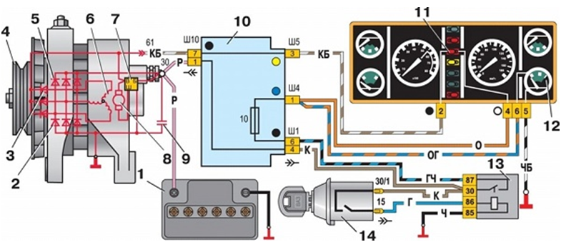 1 — АКБ; 2 — Крыльчатка генератора; 3 — Диоды защиты; 4 — Шкив привода; 5 — Выпрямительные диоды; 6 — Обмотка статора; 7 — Регулятор напряжения; 8 — Обмотка возбуждения; 9 — Фильтрующий конденсатор; 10 — Блок предохранителей; 11 — Контрольная лампа на приборной панели; 12 — Вольтметр; 13 — Реле включения зажигания; 14 — Замок зажигания.
