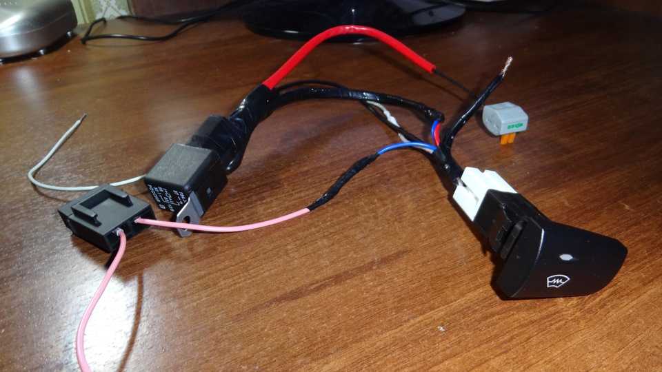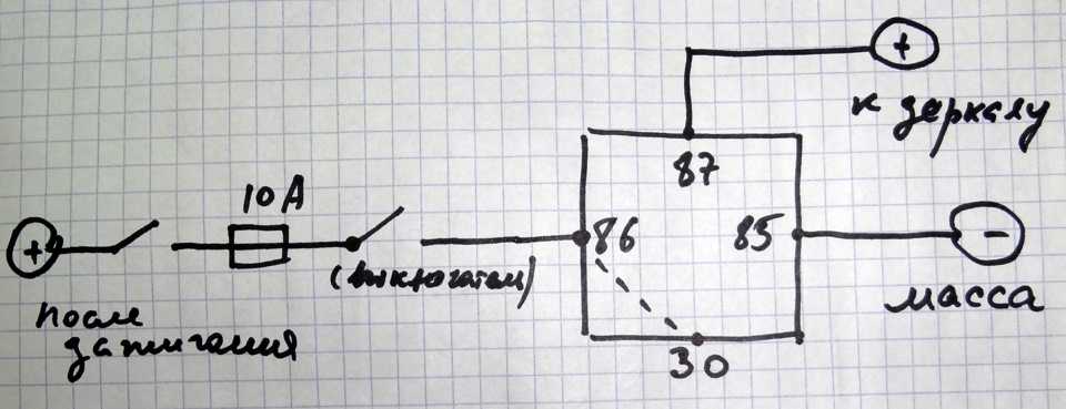 Нужно четырех контактное реле, на 86 контакт, через выключатель и предохранитель подается плюс, который я взял с первого контакта кнопки обогрева заднего стекла, 86 контакт реле соединяется с 30, на 85 подается масса (корпус). Принцип действия — при включении зажигания плюс подается на первый контакт кнопки обогрева заднего стекла (я использовал эту кнопку, а крышечку поставил от обогрева лобового стекла, так как она была не фиксированная). При нажатии кнопки замыкается реле и плюс подается на 87 контакт реле, и далее поступает на зеркало. Кнопка подогрева зеркал стоит рядом с кнопкой автосвет снизу центральной консоли.