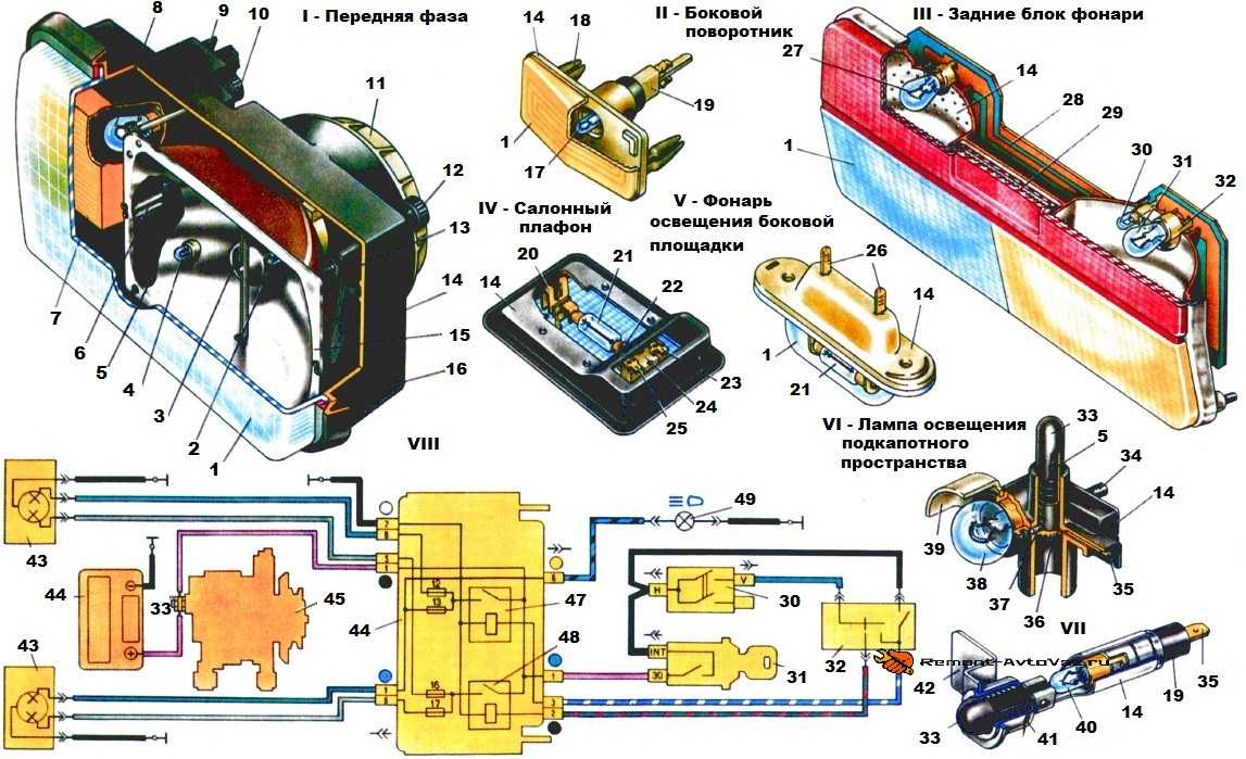 I – передняя фара; II – боковой поворотник; III – задние блок-фонари; IV – салонный плафон; V – фонарь освещения номерной площадки; VI – лампа освещения подкапотного пространства; VII – схема включения передних фар.