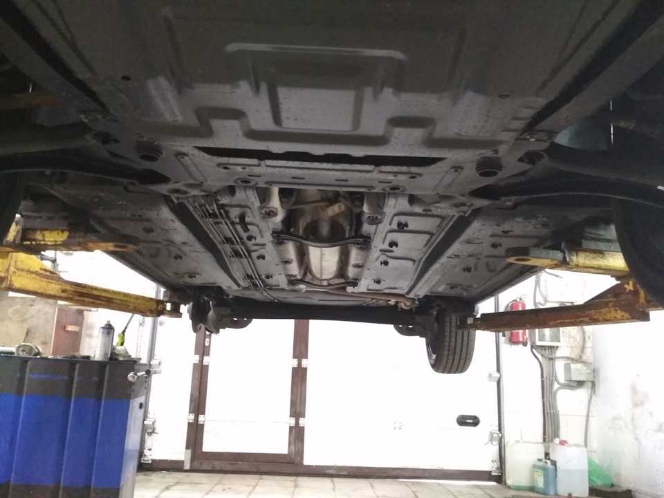 9. ДнищеКстати, на сервисе посмотрел на машину снизу и доволен осмотром: реально гладкий пол, ничего не торчит, кроме двух полухомутов вокруг тоннеля глушителя. Антикор вроде неплохо сделан. Защита картера по толщине не отличается от штатной, но у неё нет дырки вокруг картера — это плюс. И нет дырки для замены масла — это минус.