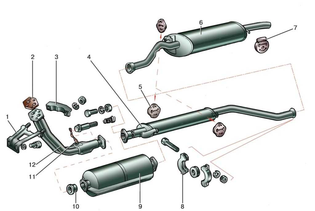 1 — кронштейн для крепления приемной трубы; 2 — прокладка; 3 — прижимное приспособление для кронштейна; 4 — дополнительный глушитель; 5,7 — «подушки» для подвески глушителя; 6 — главный глушитель; 8 — хомут, соединяющий трубы глушителей; 9 — нейтрализующее приспособление; 10 — кольцо уплотнения шарниров; 11 — датчик, контролирующий концентрацию кислорода в выбросах; 12 — приемная труба для глушителей