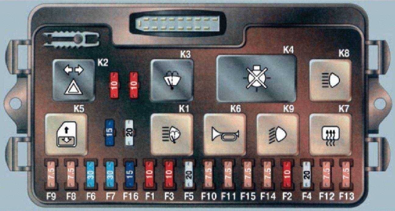 Расположение реле и предохранителей в монтажном блоке: К1 – реле включения очистителей фар; К2 – реле-прерыватель указателей поворота и аварийной сигнализации; К3 – Реле стеклоочистителя; К4 – реле контроля исправности ламп; К5 – реле включения стеклоподъемников; К6 – реле включения звуковых сигналов; К7 – реле включения обогрева заднего стекла; К8 – реле включения дальнего света фар; К9 – реле включения ближнего света фар; F1-F20 – плавкие предохранители