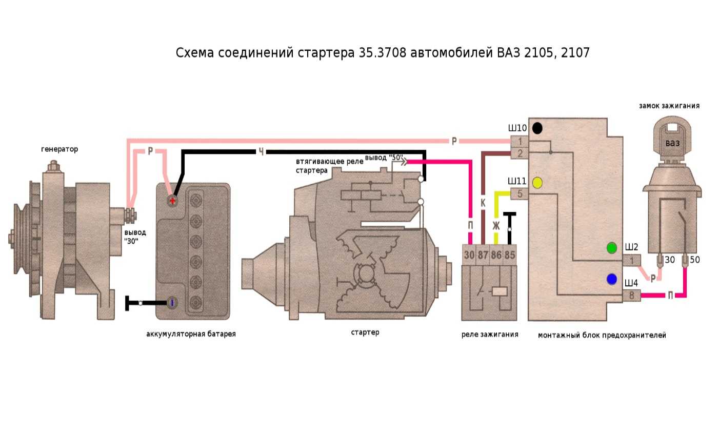 Расшифровка схемы соединений стартера ВАЗ 2106: