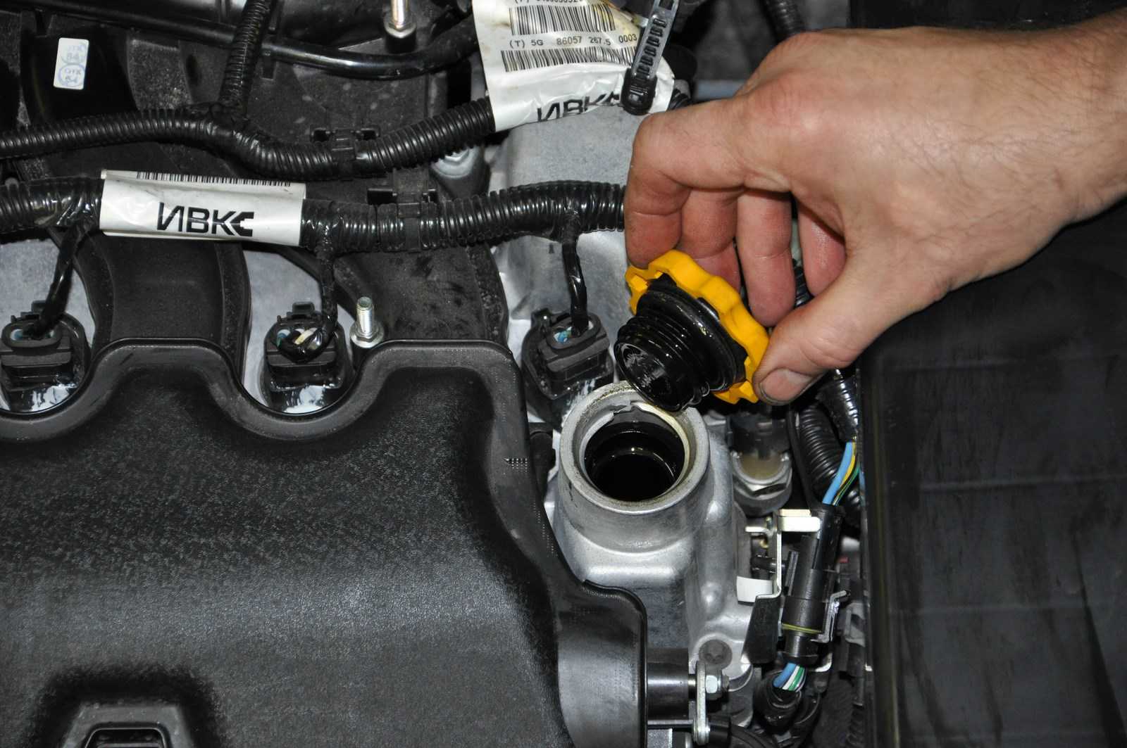 - Промывочное масло заливается в заливную горловину. Она находится в крышке головки блока цилиндров.